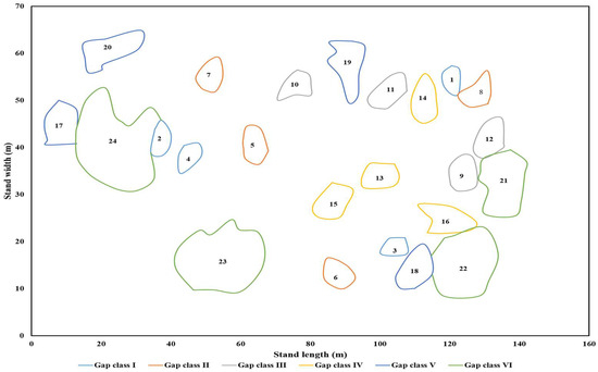 | Gap Classes | ID | Area/m2 | Length/m | Mean Height of Border Tree/m | Mean DBH of Border Tree/cm | Border Tree Species |