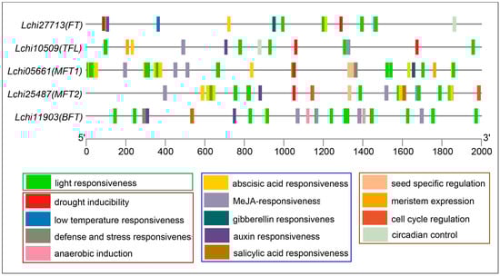 We conducted an analysis of the 2000 bp promoter sequences upstream of each PEBP gene in L. chinense. This analysis revealed multiple cis-acting elements that can be classified into four groups: hormone responses, light responsiveness, plant development, and stress responses. Among these regulatory elements, hormone-responsive elements are the most abundant, primarily dominated by MeJA-responsive and abscisic acid-responsive elements (Figure 2). Additionally, we identified gibberellin-responsive elements, auxin-responsive elements, and salicylic acid-responsive elements. The presence of light-responsive elements was also notable. Furthermore, the plant development elements included cell cycle regulation, circadian control, meristem expression, and seed-specific regulation. The stress-responsive elements comprised elements associated with drought stress, low-temperature response, anaerobic induction, defense, and other stress responses. It is noteworthy that all the genes contained abscisic acid-responsive and light-responsive elements in their promoters. However, the promoters of two MFT genes, namely Lchi05661 and Lchi25487, possessed seed-specific regulation elements that were not found in the promoters of other L. chinense PEBP genes. Additionally, only the FT (Lchi27713) and MFT1 (Lchi05561) elements featured GA-responsive elements in their promoter regions.