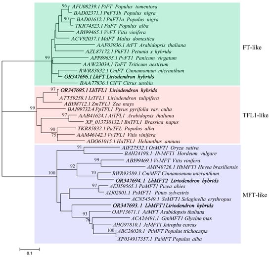 The phylogenetic tree of PEPB family proteins from Liriodendron hybrids and other plants. The tree was constructed using the maximum likelihood method in MEGA 6.0. The number at the nodes represents the bootstrap values based on 1000 replications (%). The FT-like, TFL1-like, and MFT-like subfamilies are marked by green, red, and blue, respectively. LhPEBPs are marked in bold font.