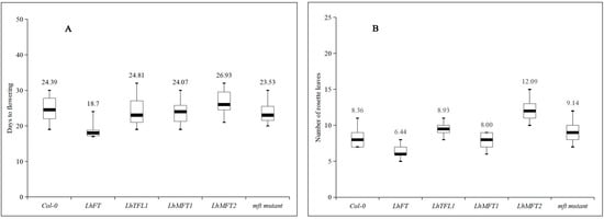 The mft mutants showed no significant differences in either bolting time or rosette leaves compared with the wild type in the present study, proving that the AtMFT gene in A. thaliana may have a weak function in flowering. Although weak, the function of the two LhMFTs in flowering showed two contrasting directions, with the LhMFT1 lines flowering slightly earlier than the wild type and the LhMFT2 plants flowering later than the wild type, but the flowering time of LhMFT2 was significantly later than that of LhMFT1. This was further confirmed by the rosette leaves (Figure 4). The number of rosette leaves of LhMFT2 was not only significantly greater than that of LhMFT1 but also greater than that of the Col-0 and mft mutants. On the other hand, the LhMFT1 lines have relatively fewer rosette leaves than the Col-0 and other transgenic lines except for LhFT (Figure 4).