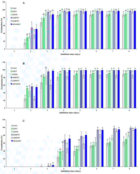 Time course of seed germination for Col-0, overexpressed LhPEBP transgenic lines, and mft mutants in Arabidopsis. Three situations, (A) under 1/2 MS, (B) 1 μM GA3, and (C) 10 μM ABA, are presented; a–c indicate the results based on Duncan’s test at a significance value of 0.05.