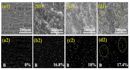 SEM images and Element B energy spectra of bamboo scrimber surface coated with different mass concentrations of h-BN. (a1,a2), (b1,b2), (c1,c2), and (d1,d2) are SEM images and Element B energy spectra of bamboo scrimber surface coated with untreated, 1%, 5%, and 10% h-BN, respectively.