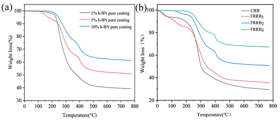 TGA curves of the h-BN pure coatings and flame-retardant bamboo scrimber samples. (a) TGA curves of the pure coating samples; (b) TGA curves of the flame-retardant bamboo scrimber samples. Note: URB—untreated bamboo scrimber; FRRB1—1% h-BN flame-retardant-treated bamboo scrimber; FRRB2—5% h-BN flame-retardant-treated bamboo scrimber; FRRB3—10% h-BN flame-retardant-treated bamboo scrimber; and the same below.