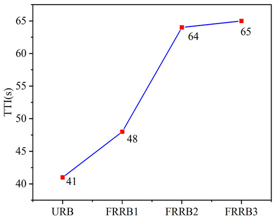 TTI refers to the sustained ignition time required to achieve flaming combustion on the surface of the material, and the longer the TTI, the less likely the material will ignite under the experimental conditions and the better the flame-retardant effect of the material. Compared to the untreated material, the ignition time of the 1% h-BN, 5% h-BN, and 10% h-BN flame-retardant-treated bamboo scrimber was improved to different degrees, by 17%, 56%, and 58%, respectively. It demonstrated that the 5% and 10% h-BN flame-retardant coatings could effectively prolong the ignition time and have a good flame-retardant effect. There was little difference in the flame-retardant effect between the 5% and 10% h-BN flame-retardant coatings.