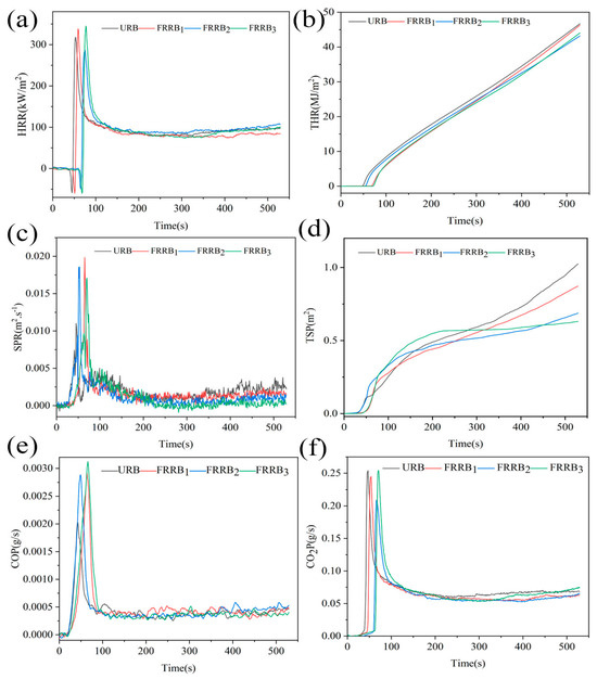 The cone calorimetric test results of the h-BN flame-retardant-treated bamboo scrimber cones: (a) HRR curves; (b) THR curves; (c) SPR curves; (d) TSP curves; (e) COP curves; and (f) CO2P curves.