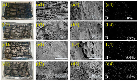 Figure 6(a2)–(d2) represent the surface morphology of the untreated, 1%, 5%, and 10% flame-retardant-treated bamboo scrimber carbon residues. Figure 6(a3)–(d3) represent the internal morphology of the untreated, 1%, 5%, and 10% flame-retarded-treated bamboo scrimber carbon residues. Figure 6(a2)–(d2) and Figure 6(a3)–(d3) depict that the untreated bamboo scrimber burnt thoroughly. As for the bamboo scrimber treated with the h-BN flame-retardant treatment, the material’s surface was smoother after combustion, and the carbon layer was retained intact and solid. Among them, the 5% flame-retardant-treated carbon layer had the best surface smoothness, which corroborated that the 5% h-BN was most uniformly dispersed in the film-forming material and that the presence of h-BN could act as a barrier between the flame and the substrate material. This carbon layer could better protect the substrate material [32].