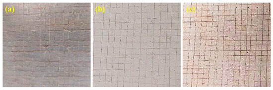Bamboo scrimber surface coating adhesion test photo. Note: (a) 1%h-BN flame-retardant-treated bamboo scrimber; (b) 5% h-BN flame-retardant-treated bamboo scrimber; and (c) 10% h-BN flame-retardant-treated bamboo scrimber.