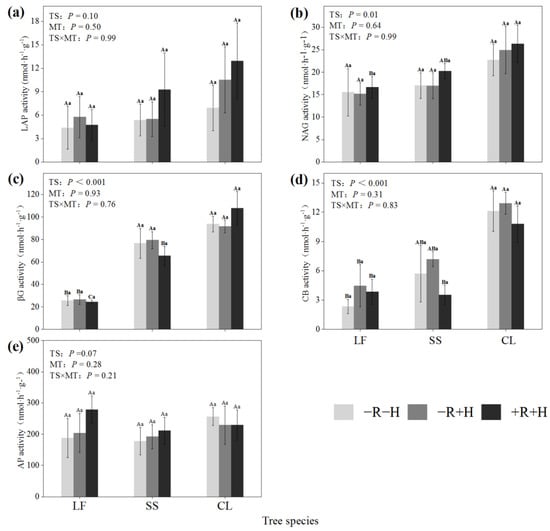 Soil hydrolase activity under different tree species and mycorrhizal restriction treatments (a–e). CL: Cunninghamia lanceolata; LF: Liquidambar formosana; SS: Schima superba; Different lowercase letters indicate that there were significant differences in different mycorrhizal restriction treatments of the same tree species (p < 0.05). Different capital letters indicate that there were significant indigenous differences among different tree species under the same mycorrhizal restriction treatment (p < 0.05).