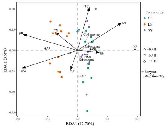 Redundancy analysis (RDA) of soil physicochemical properties and enzyme activity and enzyme stoichiometry. CL: Cunninghamia Lanceolata; LF: Liquidambar formosana; SS: Schima superba; +R + H: treatment with roots and hyphae; −R + H: treatment with hyphae but without roots; −R−H: treatment without either; WC: water content; TC: total carbon; TN: total nitrogen; TP: total phosphorus; C:N: carbon–nitrogen ratio; C:P: carbon–phosphorus ratio; N:P: nitrogen–phosphorus ratio; AN: ammonium nitrogen; NN: nitrate nitrogen; LAP: leucine aminopeptidase; NAG: β-1,4-N- acetylglucosaminidase; AP: acid phosphatase; βG: β-1,4-glucosidase; CB: β-D-cellobiosidase; C:N enzyme: In(βG + CB):In(NAG + LAP); C:P enzyme: In(βG + CB):In(AP); C:P enzyme: In(NAG + LAP):In(AP).