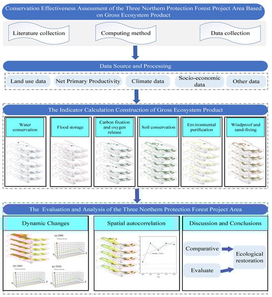 The research roadmap for this study is depicted in Figure 2. We developed a comprehensive index system for the assessment of the ecosystem gross production value in the Three-North region. This system utilizes a multitude of data sources, including land usage, net primary productivity (NPP) of vegetation, climate and meteorological data, and statistical yearbooks. We employed this system to calculate the ecosystem gross production value from 2000 to 2020. Furthermore, we analyzed the spatiotemporal evolution patterns and trends in the calculated results of the ecosystem gross production value.