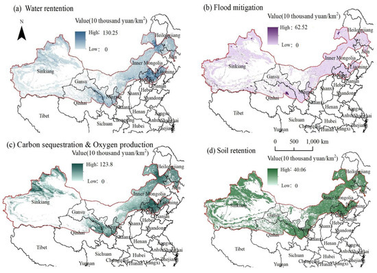 From the perspective of the gross ecosystem product (GEP), as shown in Table 3, among the six ecosystem services, carbon sequestration and oxygen release held the highest functional value, accounting for 43.71% and representing a core service function of the Three-North ecosystem. Soil retention followed as the second highest, constituting 26.24%. Subsequently, windbreak and sand fixation, water conservation, flood regulation, and environmental purification account for 17.03%, 9.93%, 2.18%, and 0.9%, respectively. Regarding ecosystem types, grassland ecosystems held the highest value at 1378.266 billion yuan, representing 68.81% of the total, while farmland ecosystems followed with 338.983 billion yuan, constituting 16.92%. Forest, shrubland, and aquatic ecosystems had comparatively lower values, amounting to 150.788 billion yuan, 76.625 billion yuan, and 58.343 billion yuan, respectively, and representing 7.53%, 3.83%, and 2.91%, respectively. Regarding per-unit area values, shrubland ecosystems exhibited the highest value at 168.5 thousand yuan/km2, closely followed by forest ecosystems at 165.68 thousand yuan/km2. Subsequently, grassland and farmland ecosystems had per-unit area values of 121.03 thousand yuan/km2 and 101.59 thousand yuan/km2, respectively. Lastly, aquatic ecosystems had the lowest per-unit area value at 83.48 thousand yuan/km2.