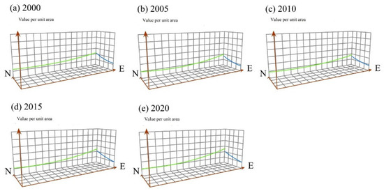 In the trend surface analysis of spatial distribution (Figure 4 and Figure 5), the results showed that, from 2000 to 2010, the fitted curves gradually declined in both east–west and north–south directions, indicating a decreasing per-unit area value. However, from 2010 to 2020, the fitted curves in both directions gradually increased, indicating a rising per-unit area value. Furthermore, the per-unit area value for 2020 was significantly higher than that of 2000, presenting an overall increasing trend over the 20-year period.