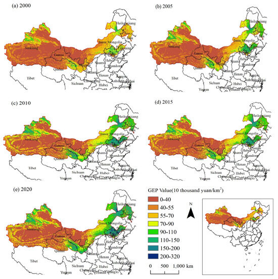 Accounting results of the GEP per unit area in the Three Northern Regions of China from 2000 to 2020.