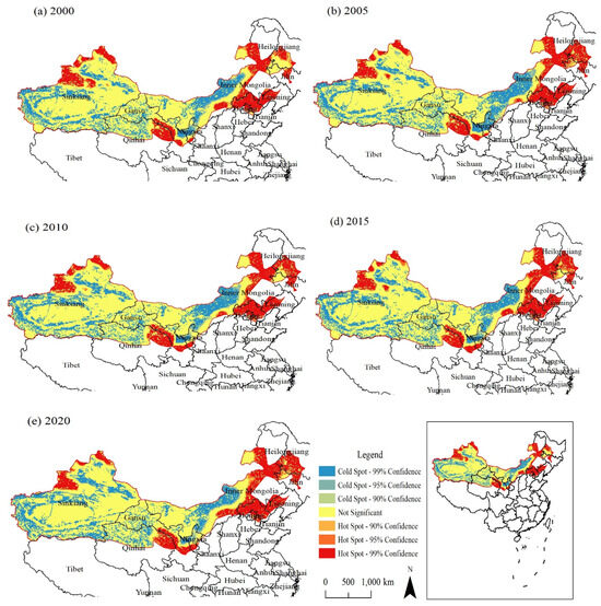 Distribution of the GEP hot spots (cold spots) in the Three Northern Regions of China from 2000 to 2020.