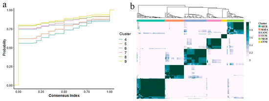 (a) Cumulative distribution function graph. (b) Consensus matrix heatmap of the six clusters. ECSI = East and Central Siberia; NEUR = Northern Europe; CANC = Central Asia and Northwestern Canada; MAEA = mid-latitude Asia, Europe, and America; SEUR = Southern Europe; CYNE = Cyprus and Nepal.