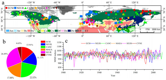 In the final classification of the MXD chronologies, the six clusters showed distinct spatial distribution characteristics. Chronologies in the same cluster did not occur entirely in the same climate zone but were located in relatively concentrated areas. According to the main distribution area of each cluster, the clusters were named from high to low latitude and comprised East and Central Siberia (ECSI), Northern Europe (NEUR), Central Asia and Northwestern Canada (CANC), mid-latitude Asia, Europe, and America (MAEA), Southern Europe (SEUR), and Cyprus and Nepal (CYNE) (Figure 3).