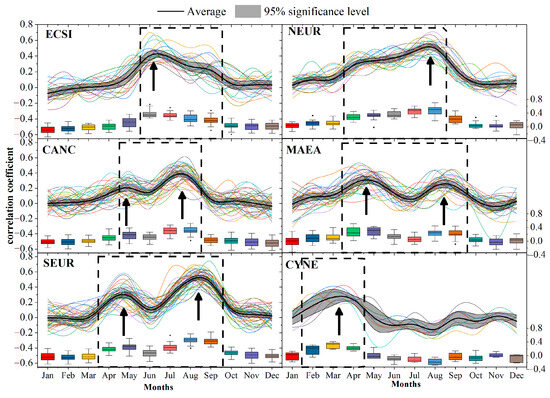The Tibetan Plateau (TIBP) and Eastern and Central Canada (ECCA) clusters in the Briff et al. classification were mostly included in the MAEA cluster, and their correlation characteristics with temperature were also consistent. The highest correlation coefficients were in August–September, with April–May representing the secondary peak interval.