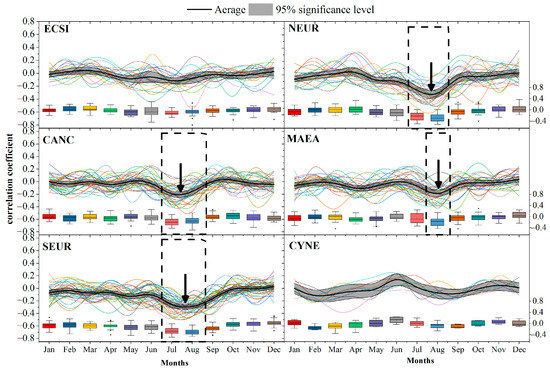 The second cluster at high latitudes was NEUR. Most sites were located in Northern Europe, but some were also distributed in Central Asia and Central Siberia. Similar to the ECSI cluster, most sites were located in the Df climate type. A significant response to the monthly mean temperature was observed from April to August, with the highest correlation coefficient in August. Most sites showed a negative response, with precipitation from July to August. These correlations differed notably from those for the ECSI cluster. The MXD chronology assemblage in Northern Europe showed a correlation coefficient of 0.76 with June and August temperatures [33]. Duthorn [34] noted that the MXD in Northern Finland was most strongly correlated with the temperature in August. The strongest correlation with the monthly mean temperature in the two clusters of high-latitude sites differed: June for ECSI and August for NEUR. The secondary peak value was variable in the NEUR cluster, so the mean monthly coefficient showed only one peak.