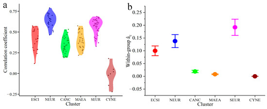 We calculated the correlation coefficients and spatial synchronization of the CVM model between the MXD chronologies for all clusters and April–September monthly mean temperatures to compare differences in climate sensitivity among the clusters (Figure 6). The NEUR and SEUR clusters in the European region showed the strongest correlation with April–September temperatures. The correlation coefficients for the NEUR cluster were slightly higher than those for the SEUR cluster. The maximum coefficient value in the NEUR cluster was more than 0.75. Except for the CYNE cluster, no significant difference in sensitivity to temperature was observed among the other three clusters, and the correlation coefficients ranged from 0.2 to 0.6.