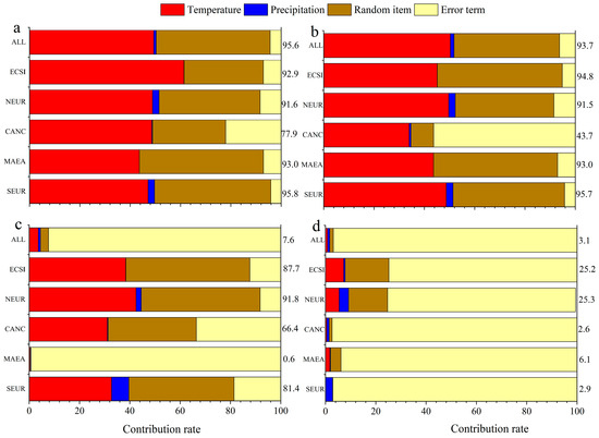In addition, mixed models incorporating the three random variables individually were established (Figure 7b–d). Latitude and longitude were the main contributors to the random effects for all MXD chronologies, explaining about 41.9% of the total variance. Excluding CANC, the latitude and longitude of each cluster explained 39%–49% of the variance in the model. Elevation did not significantly affect the model for all chronologies. The ECSI, NEUR, and SEUR clusters each had a relatively restricted spatial distribution and were significantly affected by elevation, whereas the MAEA cluster was not obviously influenced by elevation. This may be due to the broad geographic distribution of the MAEA cluster, and thus the influence of elevation is on a comparatively small scale. In contrast to the other clusters, elevation was the main influencing factor contributing to the random effects for CANC. This may be because this cluster is mainly distributed in the Cold Without Dry Season (Df) climatic area, and some mid-latitude sites are distributed in the Arid Steppe (Bs) area. The trees in this cluster all grow in cold mountainous regions at elevations above 2200 m at mid-latitudes, and the elevation decreases with an increase in latitude. Therefore, the change in elevation is a major influencing factor for this cluster. Tree species is not an important factor influencing the climatic response of the MXD chronologies in each cluster. However, tree species may contribute more than 15% of the random effect at high latitudes, which indicates that tree species at high latitudes may affect the climate response of the MXD.