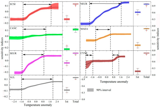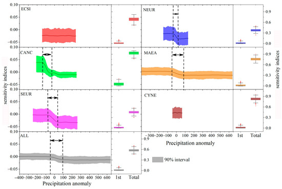 The main-effect sensitivity of MXD chronologies of all clusters to precipitation mainly showed a negative linear response within a certain precipitation interval (Figure 9). The ECSI and CYNE clusters showed no sensitivity to precipitation, which was consistent with the correlation analysis between each cluster and July–August monthly precipitation. The main-effect sensitivity of CANC was predominantly between −140 and −40 mm. The first-order and total sensitivities of this cluster were the highest among all clusters, indicating that the precipitation of the region had a significant influence on the main effect. The MXD responded negatively to precipitation change in the period of low precipitation, whereas change in precipitation had no influence on the MXD in the period of severely low precipitation or when the precipitation was sufficiently high to meet the needs for tree growth. The main-effect sensitivities of the NEUR, SEUR, and MAEA clusters responded to precipitation in the region of zero precipitation anomaly. Their first-order sensitivity index values were low, indicating that precipitation had little influence on the main effect. However, a certain degree of total sensitivity indicated that precipitation may influence MXD sensitivity to temperature, but temperature limitation creates additional sensitivity to precipitation [33].