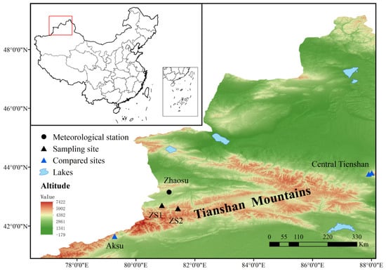 Yili Basin is located at the northern foot of the West Tianshan in Xinjiang, surrounded by mountains on three sides and open to the west, between Keguqin Mountain, Bolohoro Mountain, Wusun Mountain, and Narati Mountain in the Middle Tianshan [], forming a terrain of “three mountains sandwiching a valley and a basin” []. Due to its deep location in Eurasia and the influence of the surrounding plateaus and mountains, water vapor from the Pacific and Indian Oceans is challenging to reach. However, this valley opens to the west, and warm, humid air can arrive from the Atlantic carried by the westerly wind [,]. In the Yili area, forest resources are abundant because of the unique terrain and climatic conditions, and P. schrenkiana is mainly distributed at an altitude of 1200~3500 m []. Yili Kazak Autonomous Prefecture is part of the semi-arid and semi-humid cold climate type of continental temperate mountainous region. The sampling sites are located southwest (Figure 1), with an annual average temperature of 2.9 °C, an annual rainfall of 511.8 mm, and an average annual water evaporation of 1261.6 mm.