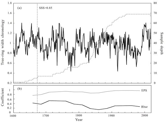 The STD chronology and sample depth (gray line) (a); The Rbar and EPS statistics (b). The vertical dashed line indicates the year 1673 when the SSS > 0.85.