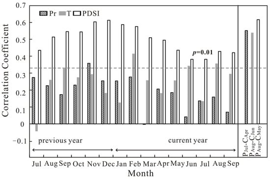 Correlations between the STD chronology and precipitation, mean temperature, and PDSI from 1960 to 2018. The gray dotted line indicates the 99% confidence level.