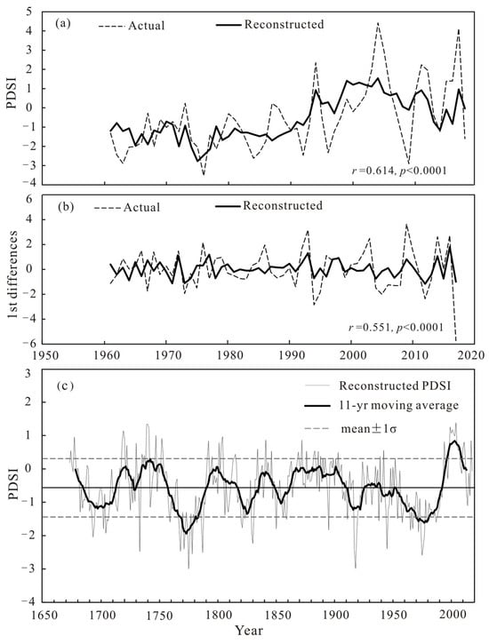 In the formula, PDSIP8C5 is the average PDSI value from the previous August to the current May, and STD is the standard chronology of tree-ring width. R2 is the explained variance, and R2adj is the explained variance after adjusting the degrees of freedom. The D/W value [] is used to test the residuals of the reconstructed sequence, and the residuals have a positive correlation when D/W < 2. Table 2 shows the test of the equation by Bootstrap and Jackknife methods. All parameters measured by the test system are very similar to the calibrated parameters, indicating that the reconstructed equation is reliable and suitable for the PDSI reconstruction. Figure 4 compares the PDSI with the reconstructed PDSI (1960–2018) in this study area, and the reconstructed series are consistent with the PDSI. However, the amplitude changes are different. After first-order difference detrending, the correlation coefficient is 0.551, and the changes have a similar trend (Figure 4b). This statistical analysis validates our reconstruction model, which may represent a long-term variation of dry and wet in the Yili Basin since 1673.