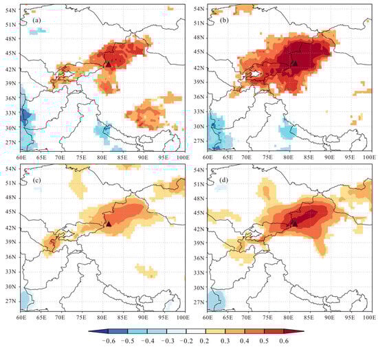 According to this reconstruction series, the PDSI in the Yili region exhibited a marked upward trend after the dry period in the 1980s, consistent with precipitation in the Tianshan Mountains of Xinjiang, which has increased in recent decades []. In addition, the climatic humidification trend in the 1980s was also reflected in the central Tianshan (Figure 6c). This warming and the humid trend are in line with previous studies []. The increase in temperature and humidity is believed to be linked to strengthening water vapor transport due to the combined effects of the tropical Indian Ocean and the regional atmospheric circulation system [].