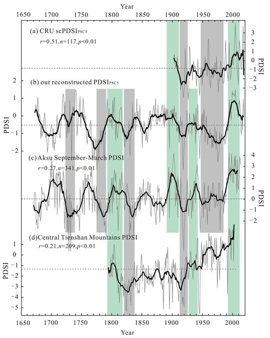 Comparisons between (b) the reconstructed PDSI in this study (1673–2018) and (a) the CRU scPDSI TS 4.05 (1901–2018), (c) the reconstructed September–March PDSI in the Aksu area (1466–2013) [], (d) the reconstructed April–June PDSI for the central Tianshan Mountains (1794–2002) []. All gray lines represent the original series, the dotted gray lines represent the mean value of sequences, and black lines are the 11-year moving average series. Green and gray bands mark the wet and dry periods.
