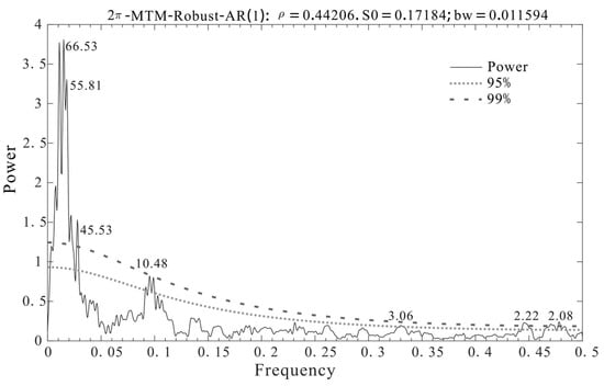 Furthermore, the reconstructed series was compared with other climatic records around the study area. The spatial correlations between the actual PDSI and reconstructed PDSI and the global gridded PDSI data and the gridded Hadley Centre Sea-surface Temperature Data Set Version 1 (HadISST1) were analyzed by using the KNMI Climate Explorer (http://climexp.knmi.nl, accessed on 24 August 2023) from 1960 to 2018. The Multi-taper method (MTM) [] has been used to identify the major periods present in our reconstructed sequences. In addition, we computed the correlation between the reconstructed sequence and the sunspots, the North Atlantic Oscillation (NAO), and the Atlantic Multidecadal Oscillation (AMO). Studies have indicated that low-frequency change information is more dependable in reconstruction efforts []. To highlight decadal-scale changes and long-term fluctuations, an 11-year moving average was used for the sequential comparison analysis [].