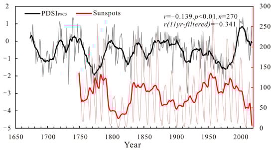 Periodic analysis of reconstructed PDSIP8C5 during 1673–2018 using the MTM identified some significant inter-annual (2–3 years, 10–11 years) and inter-decadal (55.8 years, 66.5 years) quasi-periodicity (Figure 7). The 2–3-year cycle is consistent with the quasi-biennial atmospheric oscillation []. This cycle has also been found in other dendroclimatic studies in arid Central Asia [,]. And the 10–11-year cycle may be related to the sunspot activity []. The analysis of reconstructed PDSI and sunspot activity shows that the long-term variation of the two has an apparent anti-phase relationship (r = −0.139, p < 0.01, 1749–2018) (Figure 8). Increased solar activity causes the Earth’s surface to receive more solar radiant energy, which may accelerate water evaporation from the surface, leading to greater drought. The 55-year cycle has also been observed in the streamflow reconstruction of the Qingshui River [], the temperature reconstruction of the Altai Mountains [], and drought reconstruction for the Aksu area []. The 55.8-year cycle may be related to a 40–50-year cycle of oscillation in the climatic system, which could potentially correlate with abnormal fluctuations in the thermohaline circulation of the North Atlantic [,]. The 66.5-year cycle may coincide with solar activity [,], suggesting that moisture variability in the Yili region may be strongly associated with solar activity.
