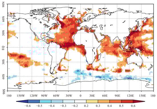 Spatial correlation between reconstructed PDSI and August–May HadISST1 (1960–2018).