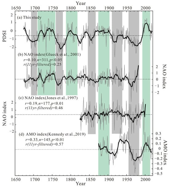 Comparisons between (a) our reconstructed PDSI and (b) the reconstructed winter NAO index (1673–1983) [], (c) the reconstructed winter NAO index (1821–2000) [], and (d) the AMO index (1874–2018) []. All gray lines represent the original series, the dotted gray lines represent the mean value of sequences, and black lines depict the 11-year moving average series. Light green and gray bands mark the wet and dry periods.
