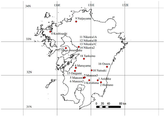 We used 118 datasets collected from 18 pure and uniformly aged Hinoki forests in Kyushu Island, southwestern Japan (Figure 1, Table 1). The latest measured ages for each survey plot ranged from 54 to 113 years (Table 1). The plot sizes varied from 0.065 ha to 0.493 ha (median: 0.168 ha; mean: 0.197 ha). Throughout the study period, the total tree height and diameter at breast height (DBH) of all living trees were measured multiple times, with intervals of approximately 5 years for young plots (approximately < 50 years) and approximately 10 years for older stands.
