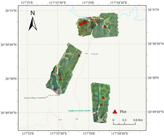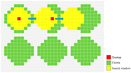 After processing the CHM of the 10 sample plots, a smoothing process was first applied to them using a window size of 0.4 m. Next, the local maximum method was used to extract the positions of the treetops in the 10 sample plots, with the search radius of the local maximum set to half of the minimum canopy width in the study area. The results of extracting treetops in the 10 sample plots are shown in