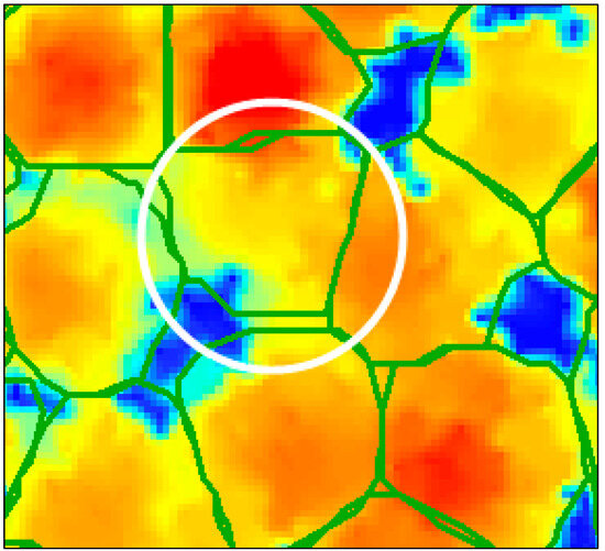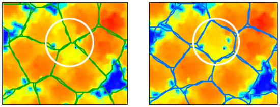 25]. As shown in the figure, the single-tree segmentation result (circled in white) includes part of the crowns of the other trees. By applying the improved K-means algorithm, we were able to significantly improve the accuracy of single-tree segmentation. We suspect that this effect may be due to the local maximum method, which allows the improved K-means algorithm to identify appropriate initial clustering centers. In addition, height weighting sensitivity helps to maintain clustering near the tree top, reducing the occurrence of over-segmentation. This phenomenon is similar to the watershed method, which often suffers from over-segmentation, resulting in the same target being divided into multiple objects and losing the original features of the segmentation target. The marker watershed method adds marker points to avoid over-segmentation of a target [