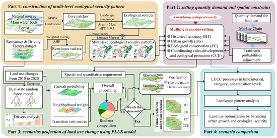 We constructed an ESP-PLUS framework to model multiple scenarios of LUCC considering ecological security. The framework involves four parts (Figure 2). First, multi-level ecological security patterns using MSPA and circuit theory were constructed. Second, the transition probabilities between land categories were modified by the MC model, and then we set the land demand of multiple scenarios combining the multi-ESP. Third, the outputs of the first two parts were incorporated into the PLUS model to project multiple scenarios of LUCC. Finally, to evaluate future LUCC under different scenarios, we analyzed the LUCC processes at the different levels and spatial pattern evolution.