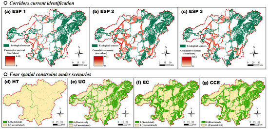 Different ESP levels were structured according to the extent of ecological corridors formed by various cumulative resistance thresholds. Studies have found that the minimum width required to protect birds is 200 m, the minimum width required to form a diverse landscape structure is 600 m, and the minimum width required to foster a close natural habitat is 1200 m [78,79]. According to previous research, ecological corridors with cumulative resistance thresholds of 1000, 2400, and 3200 were designed, corresponding to ESP1, ESP3, and ESP2 [43]. Also, Figure 3 shows the four spatial constraints under different scenarios.