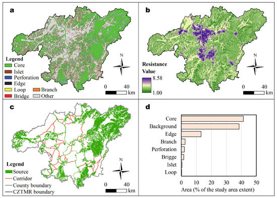 Identification of ecological sources and corridors in the CZTMA. Note: (a) landscape distribution under the MSPA method; (b) resistance surface; (c) ecological security pattern; (d) landscape structure.