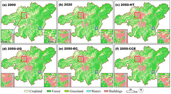 Historical land use/cover maps (a,b) and simulated maps (c–f) in 2050 under the four scenarios in the CZTMA. HT: historical tendency; UG: urban growth; EC: ecological conservation; CCE: coordinating city development and ecological protection.
