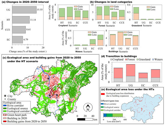 Scenario comparison in the land change process during 2020–2050. Note: different scenarios’ overall changes at interval level (a); scenario differences at category level (b); ecological area and buildings gain from 2020–2050 under the HT scenario (c); other land categories’ transition to buildings (d); ecological area loss distribution due to buildings growth under the HT scenario (e); HT: historical tendency; UG: urban growth; EC: ecological conservation; CCE: coordinating city development and ecological protection.
