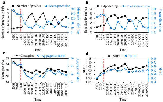 Landscape pattern analysis in the CZTMA. Note: number of patches and mean patch size (a); edge density and fractal dimension (b); contagion and aggregation index (c); SHDI and SHEI (d); HT: historical tendency; UG: urban growth; EC: ecological conservation; CCE: coordinating city development and ecological protection. The left side of the red dashed line shows the historical period, and the right side shows different scenarios in the future.
