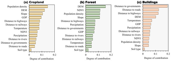 Contribution of spatial variables to the dynamic changes of (a) cropland, (b) forest, and (c) buildings in the CZTMA.