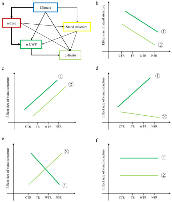 Conceptual model of direct and indirect effects on understory plant diversity (a) and the relative contribution of climate and stand structure to plant diversity (b–f). α-Tree: tree diversity. α-UWP: understory woody plants diversity (includes tree regeneration (DBH < 3 cm), shrubs, and woody lianas). α-Herbs: all herbaceous vegetation diversity. CTR: cold temperature region. TR: temperature region. WTR: warm temperature region. NSR: northern subtropical region. The slopes of stand structure and the dependent variables (α-UWP and α-Herbs) in the multiple regression were quantified as the effect sizes. If the slope is >0, the contribution of stand structure becomes stronger with the change of climate zone from CTR to NSR; conversely, the contribution of stand structure becomes weaker with the change of climate zone from CTR to NSR. ① is the stand structure effect size for understory woody plants, and ② is the stand structure effect size for understory herbs. (b) The stand structure effect size for both understory woody plants and herbs gradually decreases with increasing climate gradients. (c) Conversely, the stand structure effect for both understory woody plants and herbs gradually strengthens. (d) The stand structure effect for understory herbs declines, while the stand structure effect for understory woody plants gradually increases. (e) The stand structure effect for understory woody plants weakens, while the stand structure effect for understory herbs gradually strengthens. (f) The stand structure effect for both understory woody plants and herbs remains unchanged with increasing climate change.