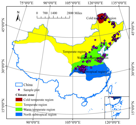 The study was conducted in northeast and north China, which are regions situated in the temperature and subtropical areas of China (Figure 2). They consist of the Heilongjiang, Jilin, Liaoning, Hebei, Beijing, Shanxi, Shaanxi, Shandong, Henan, Hubei, and Chongqing provinces, as well as the eastern part of the Inner Mongolia Autonomous Region. They include all the major forest types in temperate East Asia. For this study, we used publicly available data from the National Ecosystem Science Data Center via the National Science and Technology Infrastructure Program of China (http://www.nesdc.org.cn, accessed on 5 September 2019) and the National Earth System Science Data Center, also via the National Science and Technology Infrastructure Program of China (http://www.geodata.cn/, accessed on 21 January 2018). In the database, different types of forest plots were set up within different climate zones in China [23,24,25]; the sample plots span a latitude of 32.62–44.79 E and a longitude of 110.14–125.32 N. The data set was filtered using several criteria: (i) if data were missing for any measured values or variables, the plot was excluded; (ii) sample plots were excluded if they were imported and fell outside land boundaries; and (iii) the field survey rules were formulated according to LY/T3128-2019 (The Regulations for Classification, Survey, and Mapping of the Forest Vegetation through the Forestry Industry Standard of the People’s Republic of China). Each field plot was further filtered following three rules: (1) it should be in a natural vegetation site that is rarely disturbed; (2) it should be representative of the corresponding vegetation formation or subformation segment; and (3) it was included in the vegetation survey performed in 2014–2018. In total, 1272 plots met these criteria, including the cold temperate region (CTR, n = 157), temperate region (TR, n = 572), warm temperate region (WTR, n = 426), and northern subtropical region (NSR, n = 117). Climatic zones are divided according to Zheng et al. [26] and Yu et al. [27]; for climate variable thresholds in each climate zone, see Table S1.