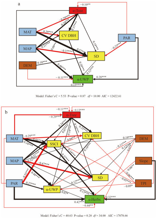 Structural equation model illustrating the direct and indirect pathways of diversity (plant α diversity), climate (mean annual temperature (MAT), mean annual precipitation (MAP), and photosynthetically active radiation (PAR)), topography DEM (elevation), slope, TPI (topography position index), tree diversity (α-Tree), tree size variation (CV DBH), stem density (SD), and stand structure complexity index (SSCI) affecting understory woody plants (UWP) and herbs. The thickness of the line indicates the relative size of the value affecting the diversity of understory woody plants (α-UWP, (a)) and herbs (α-Herbs, (b)). The black line indicates that the path coefficient is positive, while the red line indicates that the path coefficient is negative. Numbers near the solid arrows indicate the standardized path coefficients with significance levels of p < 0.001 (***), p < 0.01 (**), and p < 0.05 (*).