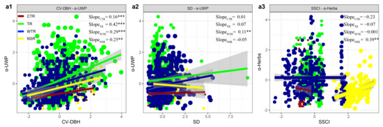 Across the temperate regions in China, we found that the effects of the stand structure on understory vegetation diversity differed in different climate zones (Figure 4). Moreover, our results showed that the effect of the SD on the α-UWP gradually increased, with the highest effect observed in the warm temperature region (WTR, effect size: 0.11) and the lowest in the cold temperature region (CTR, effect size: 0.20) (Figure 4a2). The effect of the SSCI on the α-Herbs also gradually increased, with the highest effect observed in the WTR (effect size: −0.001) and the lowest in the CTR (effect size: −0.23) (Figure 4a3). However, the effect of the CV DBH on the α-UWP did not show an obvious regularity in different climate zones (Figure 4a1). Finally, our study also found that the effect of the SD on the α-UWP, as well as the effect of the SSCI on the α-Herbs, changed significantly from the temperate regions to the subtropical region.