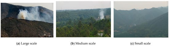 The quality of the datasets and the dimensions of the target influence the experimental results. In this paper, forest fire smoke images were taken using pan-tilt device and captured images of different locations, times and environmental circumstances. These images were labeled with Labelme and subsequently translated into the COCO format. Converting the data from json to the required txt format for YOLO compatibility followed this step. To enhance the dataset’s quality, these images are preprocessed via data augmentation, achieving a twofold purpose of feature enhancement and data expansion. The dataset contains 3966 images: 3173 are training sets, and the rest are validation sets and test sets. Typical images are shown in Figure 1.